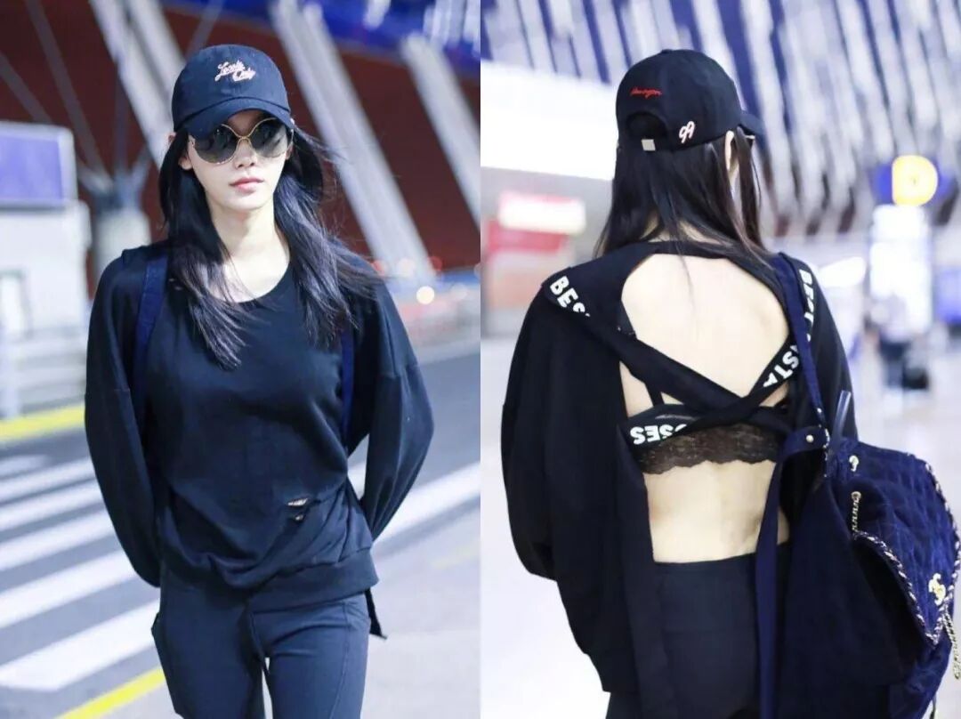 正面看平平无奇的黑色T恤,背后居然整个挖空,秀出蕾丝美背内衣,视觉冲击力杠杠的。这位“敢穿星人”再一次抓住了流量入口!