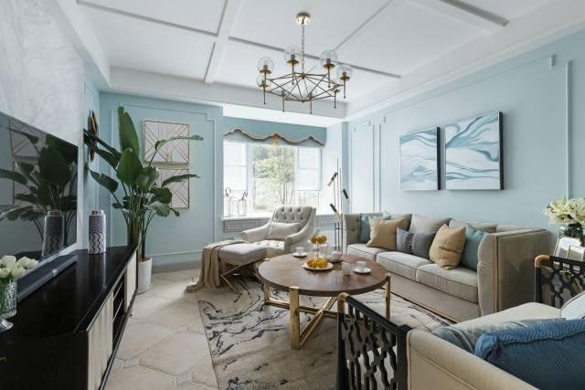 家具以及其他软装围绕着蓝色进行整体搭配,同时我们加入了一点金色作为点缀,提升了整个空间的精致度。