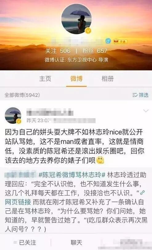昨晚(7月27日),一位认证为东方卫视导演的博主发文称:“因为自己的姘头耍大牌不如林志玲nice就公开战队骂她,这不是man或者直率,这就是情商低,没素质的陈冠希还是滚出娱乐圈吧,回你该去的地方……” 不过随后便将其删除。
