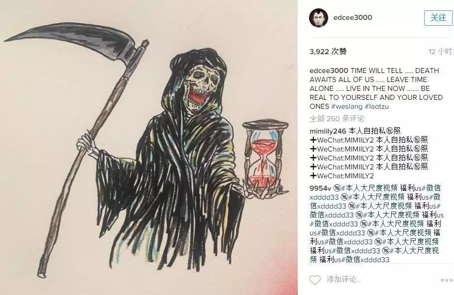 今天(7月28日)陈冠希在IG又PO出两张照片,其中一张是恐怖的死神照。