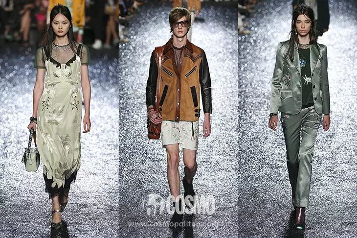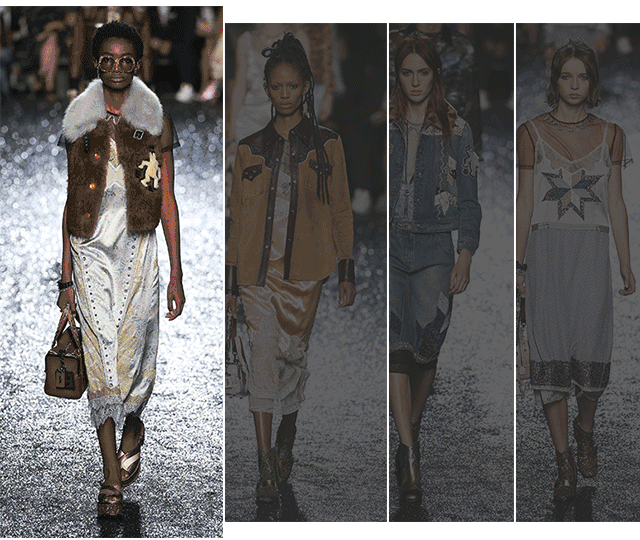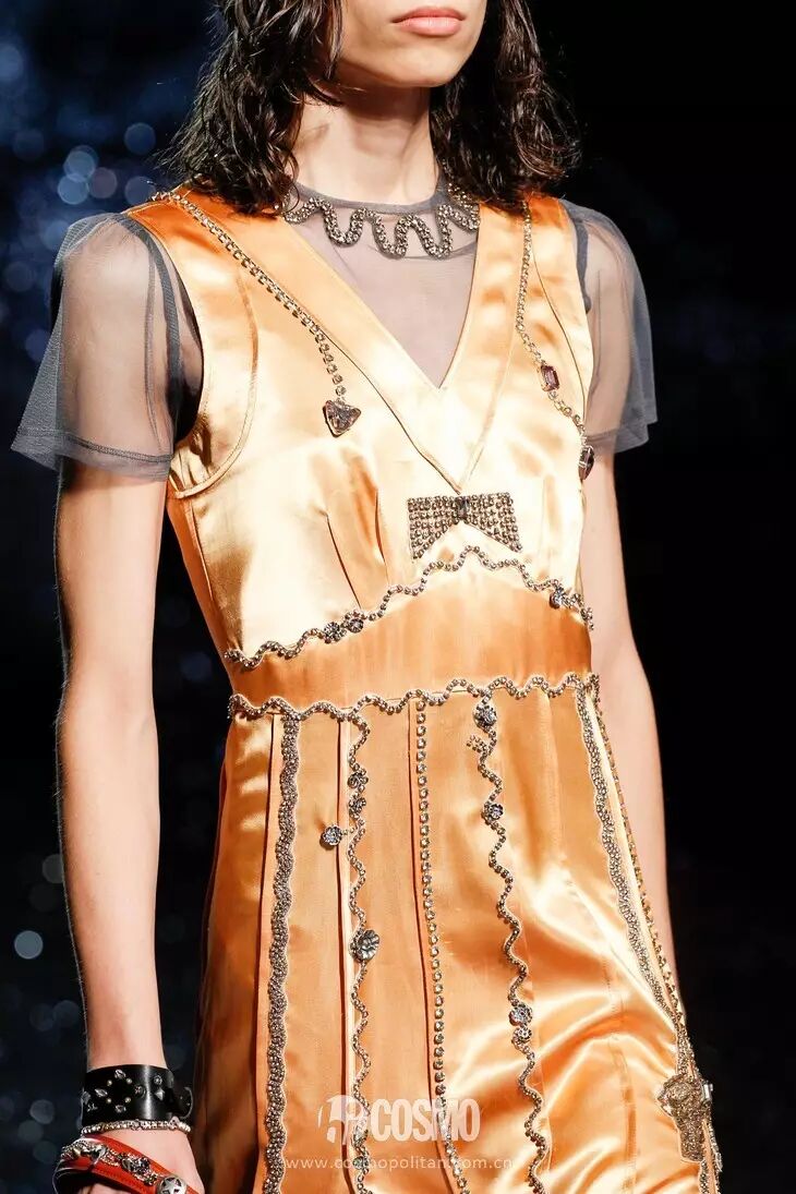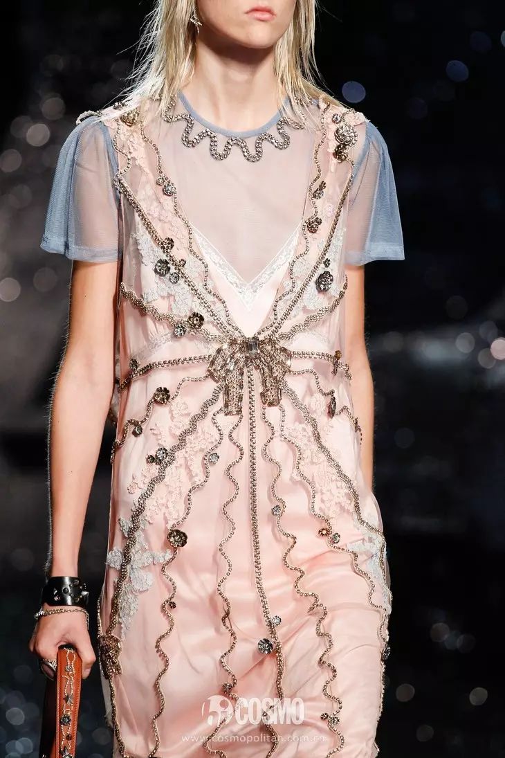 秀场上出镜率最高的毫无疑问就是睡衣裙了,上一季,Coach的裙装主打碎花,这一季的吊带裙和流行了两年的基本款有什么不同呢?这一季的睡衣裙里加上了一层透视短袖打底,突出这一季80年代朋克风的主题。