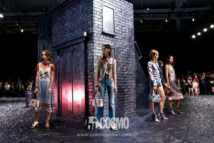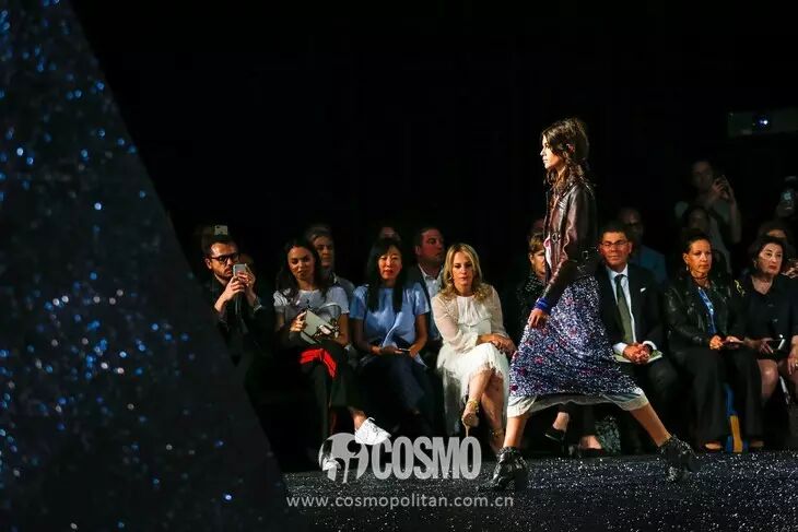 很明显的体会,这一季秀场给人一种融合了一点点暗黑风、一点点少女气的朋克复古味道。我们能在秀场上找到亮片、涂鸦各种充满摇滚风的元素,也能看到翻领外套、棒球服这种充满80年代气息的单品。特别是对于亮片的运用尤为明显,这种代表迪斯科风的元素被布置在了T台上、模特的服装上,无比闪烁。