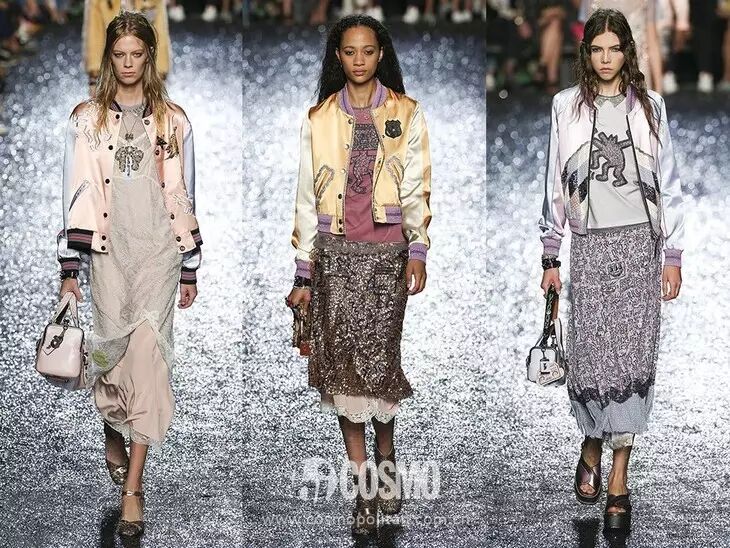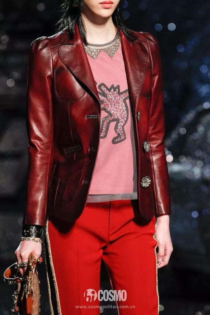 Coach秀场上我们看到了很多涂鸦装饰,都是非常突出复古感的印花,其中棒球外套和机车夹克上的卡通装饰则是纽约著名艺术家Keith Haring的经典涂鸦印花,传递出一个富有玩趣的追梦少年的形象。
