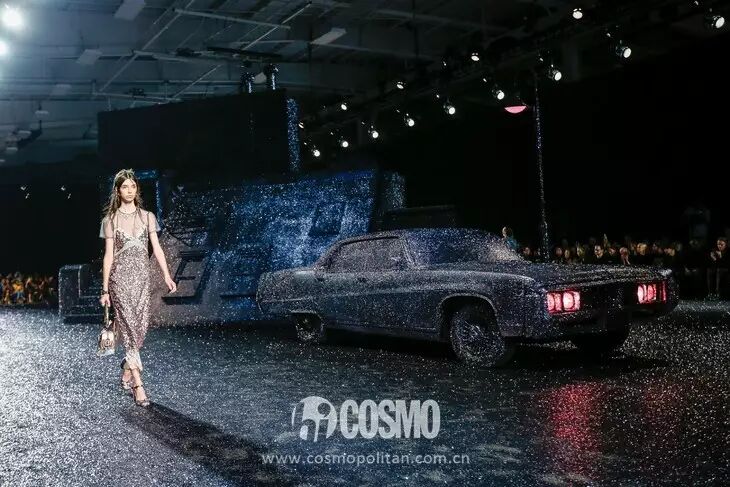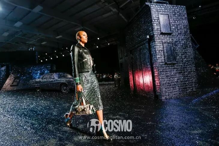 此次时装秀选址于纽约Basketball City,将纽约的街景用迤逦暗黑的风格复制到秀场,充满城市音律的音乐配合着模特们的着装,营造出一个熠熠发光的午夜派对景象。