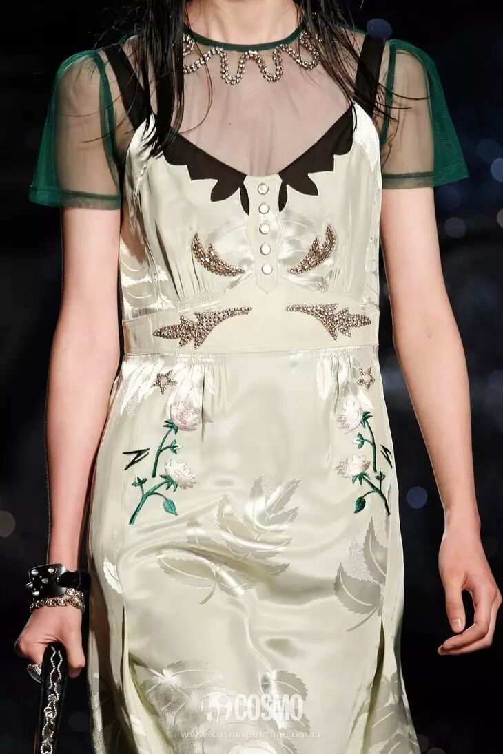 为了迎合全球各地的审美,覆盖面不止包括欧美地区,还有亚洲。大量的绸缎面料上都加入了充满古典气息的刺绣装饰,上面的纹样是非常明显的中国风。少量点缀不显夸张,很适合日装演绎。