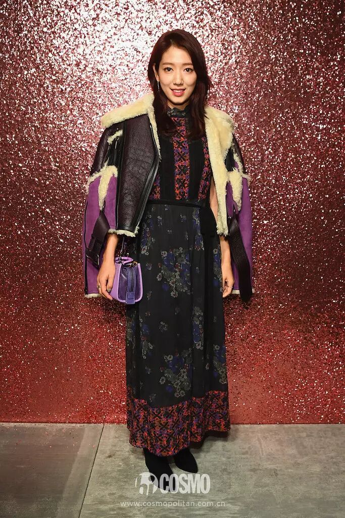 好像每个到场的女星都有一个主题色,朴信惠的主色调是紫色,碎花裙+机车皮外套的搭配也是Coach换帅之后的主打搭配之一,挎在身旁的紫色挎包起到了画龙点睛的作用。