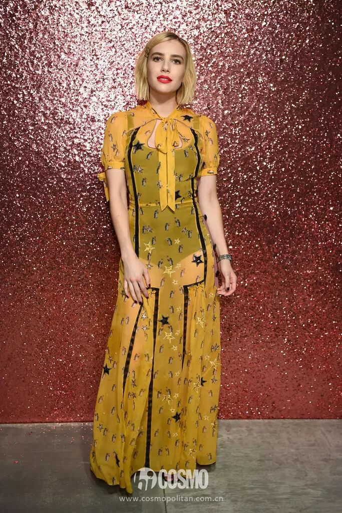 Emma Roberts最近似乎有点发福的趋势啊……黄色连衣裙内搭黑色连体衣,衣服的搭配还是无可挑剔的,就连手上的指甲油都是和服装相呼应的黑色。
