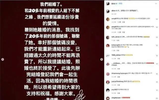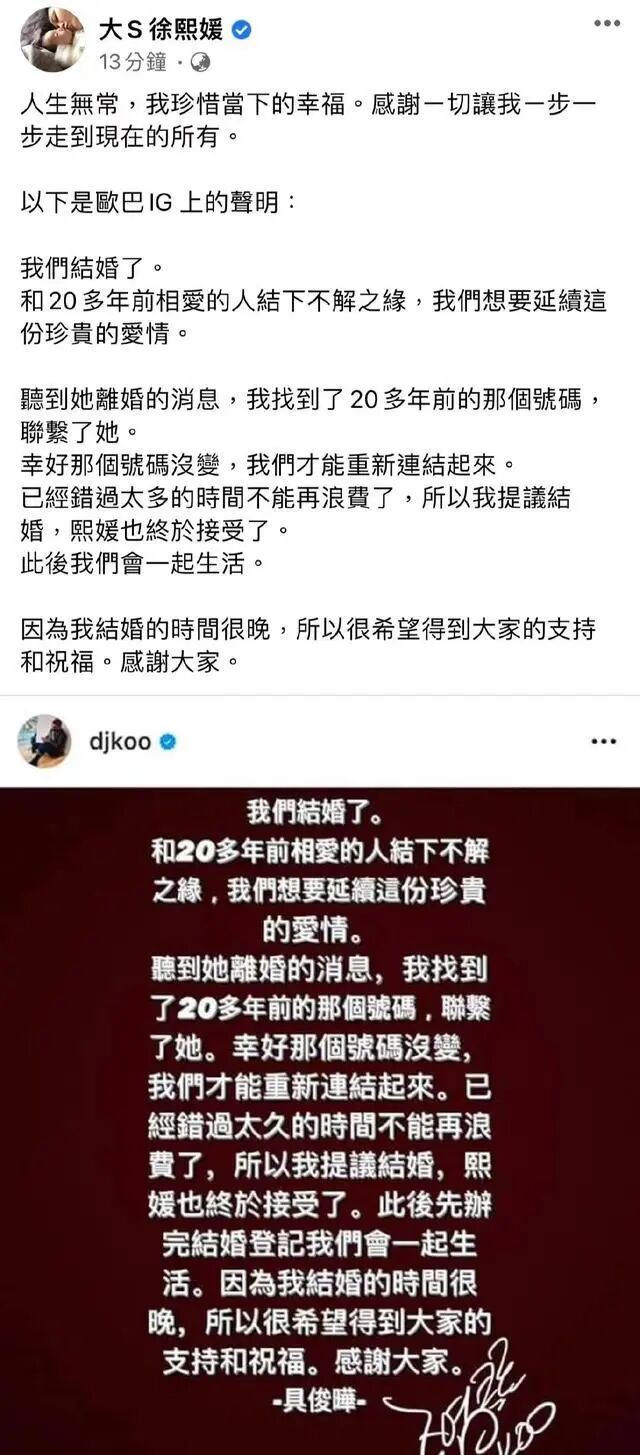 而大S也已在社交平台发文承认,她与具俊晔领证,并且复制男方发布的结婚声明。男方一句“和20多年前相爱的人结下不解之缘,我们想要延续这份珍贵的爱情”,足以表明双方对这段感情的珍视,而从大S的回复中也能够看出,她很珍惜当下的幸福,但那句“感谢一切让我一步一步走到现在的所有”,却不免让人浮想联翩。
