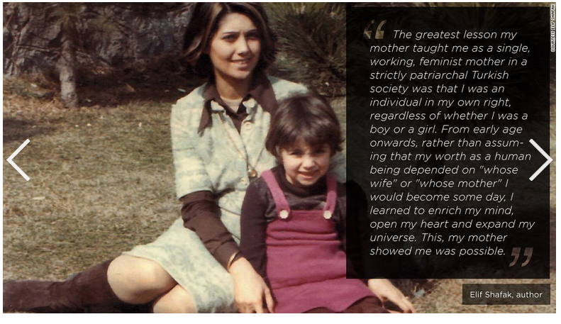 “The greatest lesson my mother taught me as a single, working, feminist mother in a strictly patriarchal(家长的,族长统治的) Turkish society was that I was an individual in my own right,regardless of whether I was a boy or a girl. From early age onwards, rather than assuming that my worth as a human being depended on "whose wife" or "whose mother" I would become some day, I learned to enrich my mind, open my heart and expand my universe. This, my mother showed me was possible.”