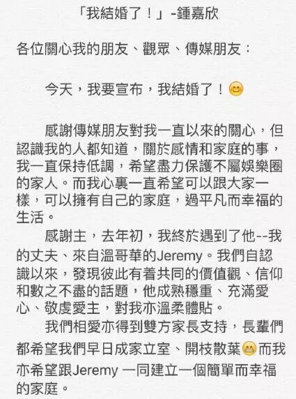 在钟嘉欣的这份公开婚讯的文字里,她也道出了作为艺人的不易,所以特意感谢一众TVB的好姐妹还有高层乐易玲等帮忙守住秘密,又希望传媒能善待老公。钟嘉欣表示她未来会是一个贤妻良母,又强调长辈希望他们能早日成家开枝散叶,疑似侧面回应已有身孕的传闻。