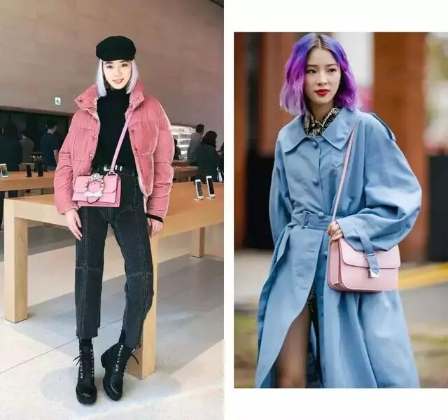 粉紫色拼浅驼色,超级少女了,在coach18春秀场上看到过。