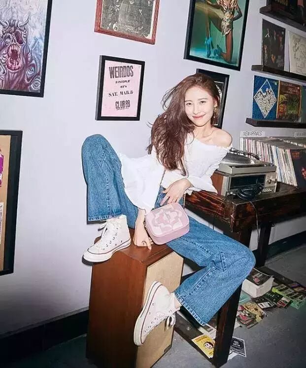 拍摄杂志时穿了件露肩衬衫配阔腿牛仔裤和白色高帮匡威。