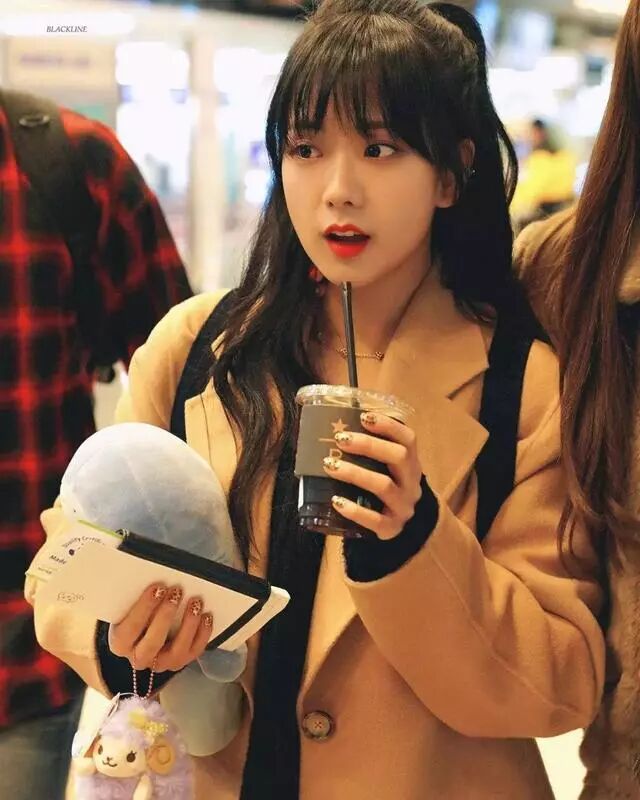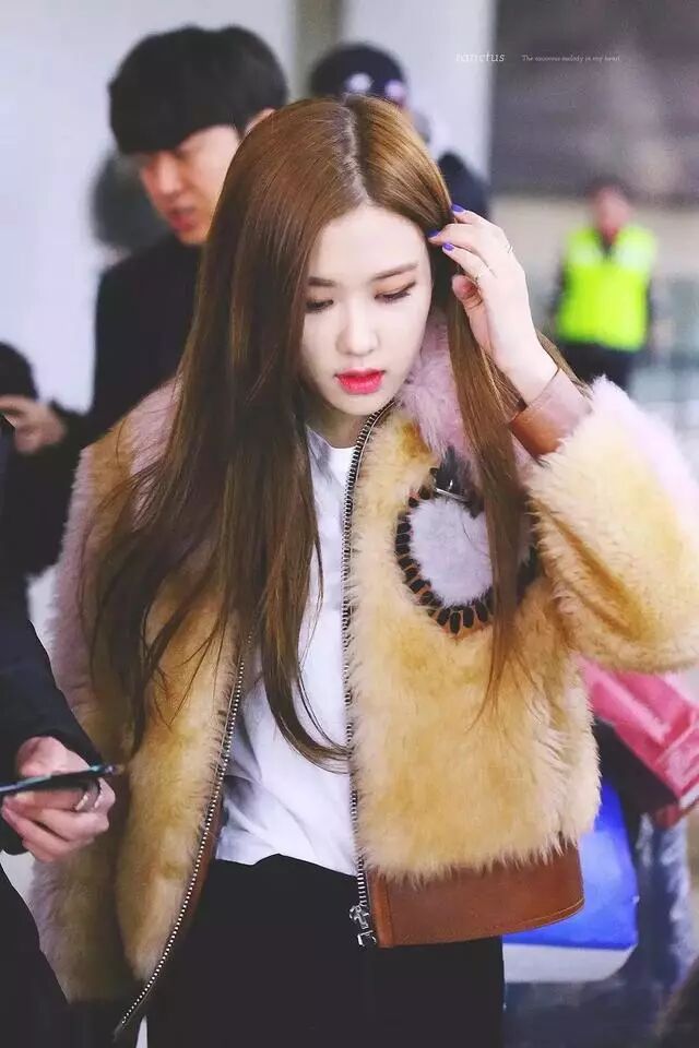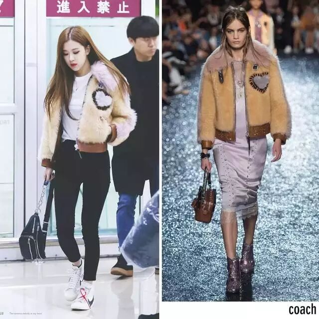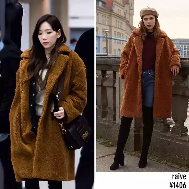 金泰妍的机场fashion用了一件棕色羊羔毛外套搞定。