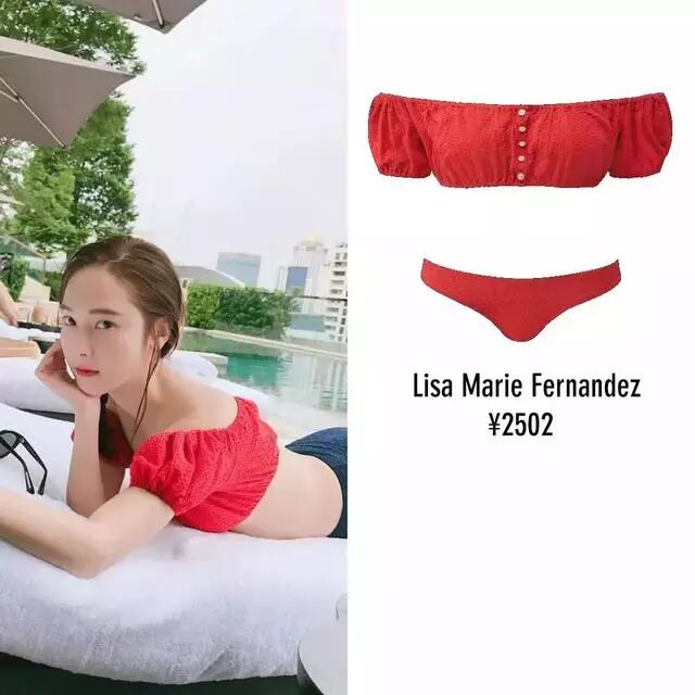 而身处泰国休假时,红色bikini来自Lisa Marie Fernandez。