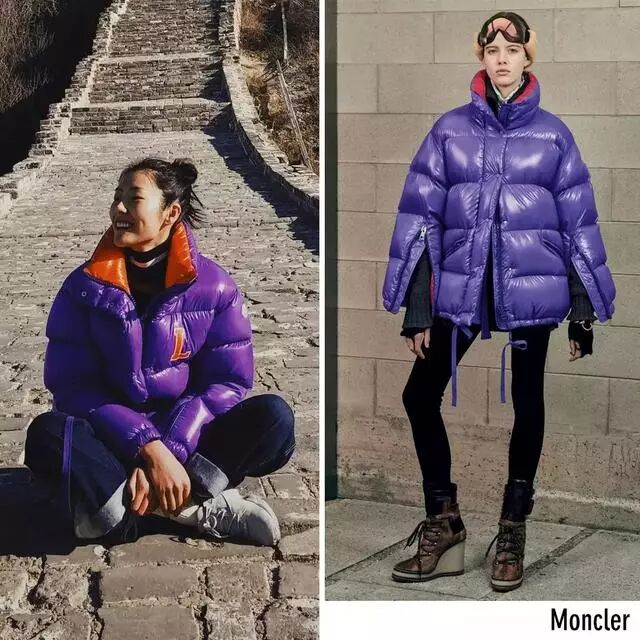 而亮眼的羽绒服,则是品牌Moncler。她这件比较特别,前后都印了自己名字“LIU”的字母。
