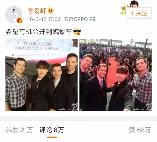 就像李易峰,每条关于《超人大战蝙蝠侠》的电影,都能带来20万的累计评论和转发。