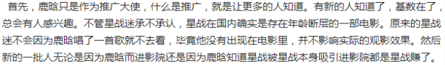 但是另一方面,虽然面对着《星球大战》粉质疑,但与此同时也不得不承认,鹿晗的粉丝群体,这一庞大的低领人群,或多或少能带来些票房。有网友这么评价:
