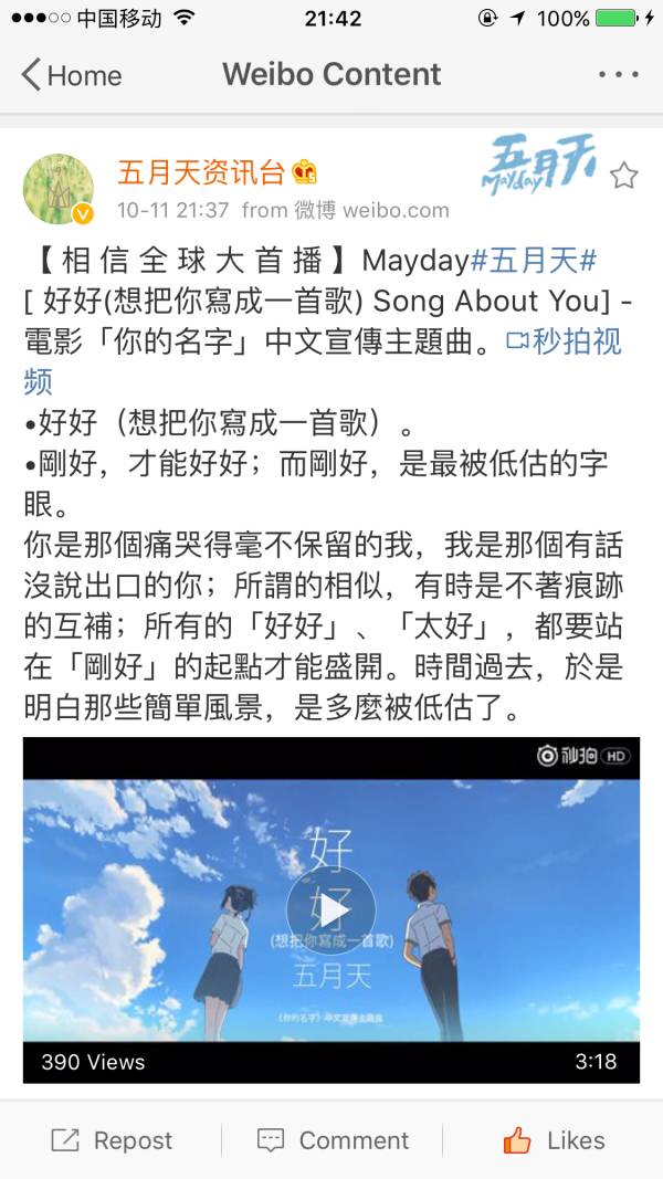 例如去年火爆的动画电影《你的名字》,就曾以五月天的《好好》作为中国推广曲,但其实《好好》并不是为《你的名字》所做,直到推出《好好》的《你的名字》MV,才得到认可。