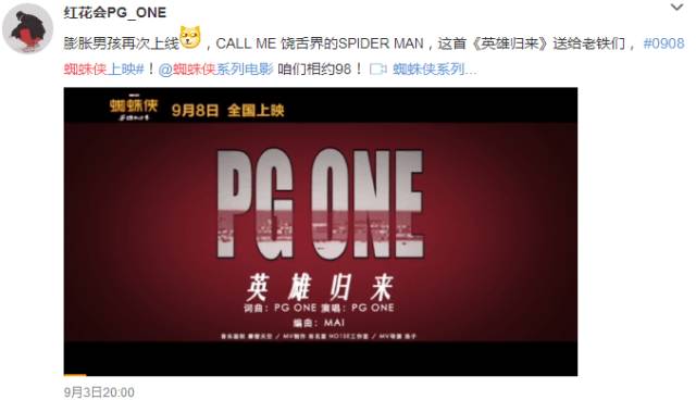 前不久,从《中国有嘻哈》中走红的选手,PG one为《蜘蛛侠》创作《英雄归来》作为中国区推广曲。除了PG one的粉丝们对此叫好外,大部分蜘蛛侠粉丝诟病这首推广曲目和电影毫无关系。