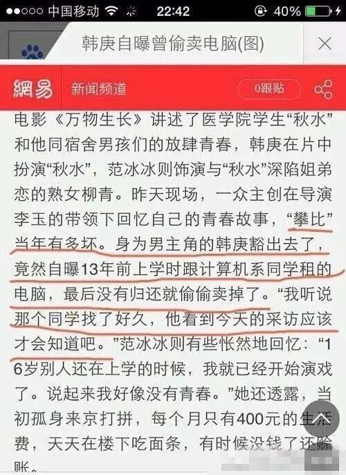韩庚与范冰冰宣传电影《万物生长》时,自己爆料,2000年左右,自己把快毕业的计算机系同学的电脑偷去卖了,还炫耀说同学找了四五年没找到。