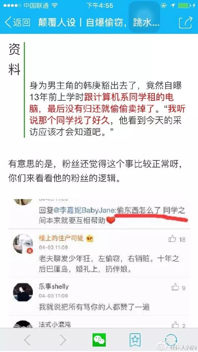 韩庚家的粉丝也是NC,有这样的爱豆,粉丝三观偏离的吓人。偷盗还可以认定是同学互帮互助,这位粉丝你平时有没有乐于助人啊!