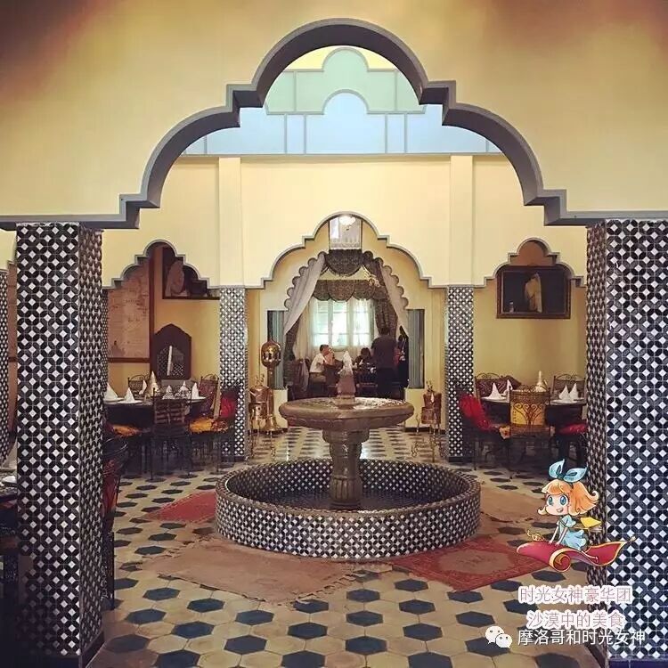 志玲姐姐和队友走进摩洛哥南部的古堡酒店餐馆。