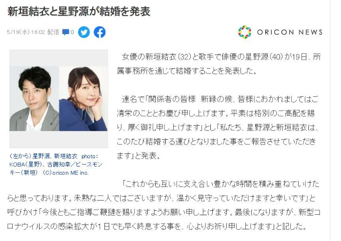 520的前一天,新垣结衣结婚了,对象是一起出演日剧《逃避虽可耻但有用》的星野源。