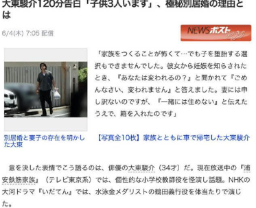 大东骏介先是曝出和妻子结婚了,妻子也怀孕了,但是却没有住在一起,也不一起抚养孩子。