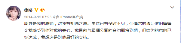 2014年,向太炮轰周星驰,在周星驰正出于风口浪尖时,不少人选择明则保身,而徐娇在微博力撑星爷:“周导是我的恩师,对我有知遇之恩。虽然已有多时不见,但偶尔的通话依旧每每令我感受到他对我的关心。我目前与星辉公司的合约即将到期,但续约的意向已经达成,我想这是对他最好的支持。”