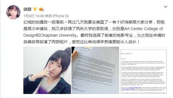 后来,徐娇在微博晒出两张录取通知书,并留言:“美国大学的录取通知都已经出来了,现已被雪城大学和迈阿密大学录取。遗憾的是加州艺术学院(CalArts)和南加大都没有录进…”