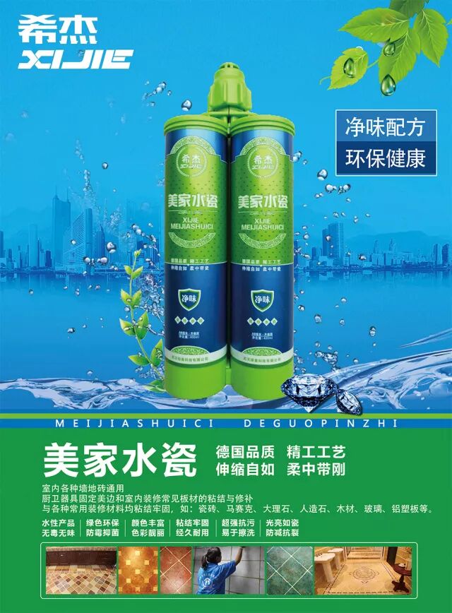 希杰美家水瓷、希杰真瓷王、希杰水性环氧填缝剂、希杰美边宝。