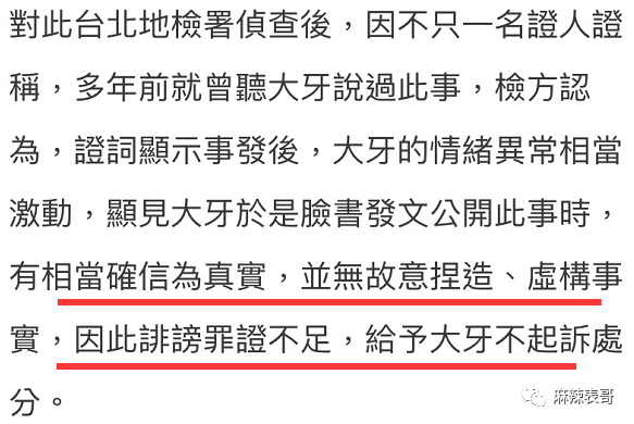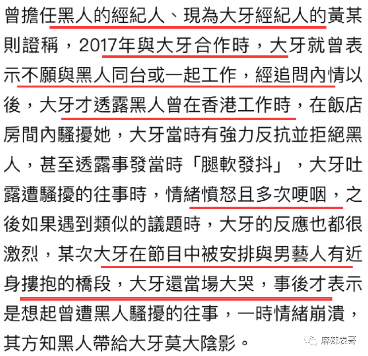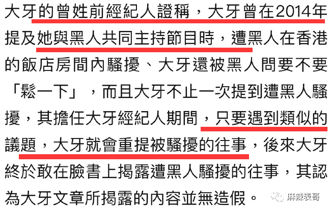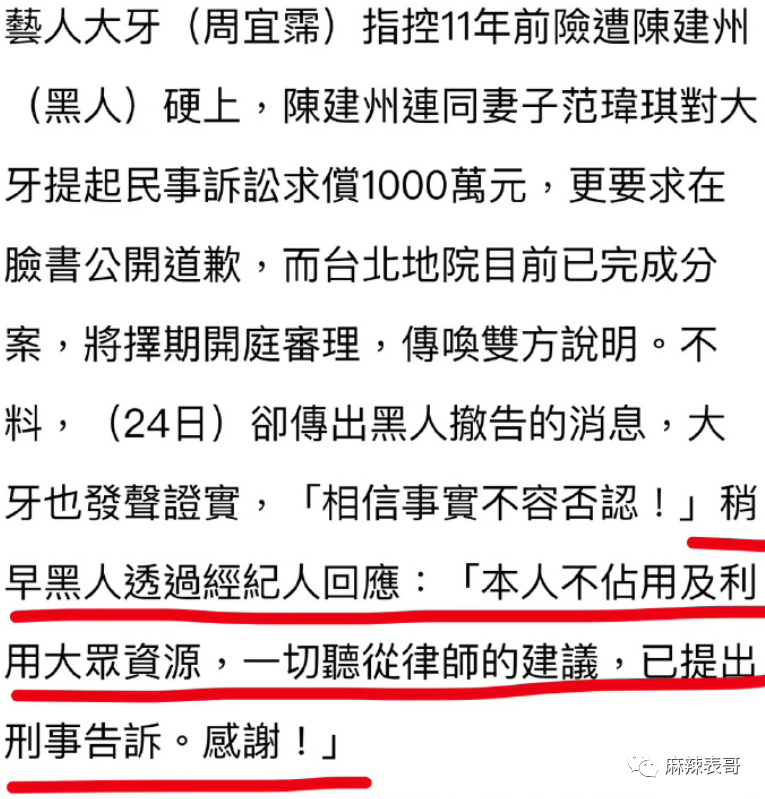 大牙告陈建州性骚扰胜诉!黑人被啪啪打脸啊…… 睡前好歌曲 港台男星 2023-12-20 16:01:50 298 创作不易,用心坚持,欢迎请BaGua喝几杯爱心咖啡!打赏并支持本文 打赏并删除本文 今日份好消息。陈建州告大牙案败诉。是的,就是大牙控诉他性骚扰,后被陈建州起诉的那件事。不太记得的,我给大家回顾一下细节。今年6月黑涩会美眉大牙爆料2012年7月18日,她和陈建州以及化妆师发型师去香港做节目,被陈建州性骚扰。包括但不限于言语挑逗、肢体碰触。比如“这么累,是不是很久没有松一下?”“你住几号房?快点啦,你不是想松一下?”、从背后环抱,说“怎么样?我壮吧!”“你又没试过,试过搞不好你会喜欢。”“没办法,你范范姐就很不爱这种事啊。”“可是你很正”等等之类。大牙说那一晚之后,她留下了很大的心理阴影,可陈建州就像没事人一样,后来还带着范范和她打招呼。十一年过去,趁着湾湾me too运动,大牙终于勇敢说出了这件事。之后就接到了陈建州夫妇的提告。划重点:告了两次。第一次,要大牙赔偿1000万台币,这笔钱陈建州夫妇会捐出去做妇女保护公益。第二次,撤诉,换成了刑事诉讼。记者问陈建州为什么要改刑事诉讼,他说要用司法捍卫自己的清白。那一天的陈建州温和平静讲礼貌,连连对记者说“辛苦了”。之后还在雨中上演了一出90度鞠躬的戏码。结果到年底,案件结果出来,陈建州败诉。这感觉像什么呢?像你出门被人踩了一脚,你找他说理,他却说你碰瓷,并叫嚣着要你好看,后来警察一来,调出监控。那一刻,不要太爽。我们看一下案件的具体经过。大牙那边来了5个人为她作证。一个是前经纪人。说2014年就听大牙提起过遭黑人性骚扰一事,只要遇到类似的议题,大牙就会重提被骚扰的往事。一个是大牙的现经纪人,曾是黑人的前经纪人。称2017年和大牙合作后,发现大牙不愿和黑人同台或一起工作,后得知是因为被黑人骚扰过。且大牙叙述时情绪愤怒,多次哽咽。此外,还有大牙的闺蜜、黑涩会美眉贝童彤以及当年在场的化妆师都出来作证。除了人证,还有物证。检察官在大牙手机里看到她发文后和闺蜜的对话,以及当年她被骚扰后到身心科就诊,这些都成为了证据。检方认为大牙没有故意捏造、虚构事实,诽谤罪证据不足。至此,我们一起给大牙鼓个掌,终于取得了胜利。而陈建州夫妇到目前为止,没有再发声。没发声好啊,说明还要脸。毕竟在这之前,夫妇俩展现的是绝对的眼瞎耳聋,无视外界的一切声音,或许他们认为多年过去大牙没有证据,才敢如此的嚣张傲慢,殊不知自己是漏洞百出。当时大牙发声后,网友们挖出陈建州曾经很多不恰当甚至奇葩的言行。比如当初亲selina。嘴巴一撅,扎扎实实按上去。亲完以后,Selina揭开面罩一看,立马捂住脸,陈建州则笑开怀。后来selina说觉得有舌头的感觉。陈建州:我没有。那一年,是2001年。后来节目播出,遭到SHE粉丝抵制,陈建州道歉结束。不只是selina,陈建州还亲过很多人,连起来或许可以排到加拿大。比如Makiyo在节目上说被陈建州亲过,吴佩慈也被亲过,Makiyo还问黑涩会美眉应该都被亲过。黑涩会美眉里的丫头说这事要问大牙,大牙知道比较多。大牙沉默了一下,苦笑道:过去的事为什么一定要讲呢。这让人想到另一期节目。陈建州抱着黑涩会美眉的腿,蔡康永问陈建州喜欢哪一个,陈建州指出其中一个,被蔡康永吐槽很低级很糟糕。2012年黑涩会美眉上《康熙来了》,重温过往回忆。说陈建州会更疼某些美眉,私下会打电话约美眉看球赛,每次选的人不一样。小S吐槽:让女生感觉说他比较疼谁,这件事不觉得很恶心吗?小S或许这么想,但范玮琪不会。她是扎扎实实的护夫狂魔,不带脑子的那种,比小S还过。2012年,陈建州被拍到在夜店和辣妹亲密互动。范玮琪回应:无聊,无需理会。而你仔细观察,会发现陈建州的每一条八卦都有味道,但范玮琪永远表示出极大的认同、包容和爱意。陈建州不仅亲女生,还亲男生。陈柏霖、罗志祥、吴彦祖、尹子维、王力宏等等都被陈建州亲过。蔡康永也没有幸免。节目上,陈建州对蔡康永说:我想亲你。蔡康永还没来得及拒绝,就被陈建州捏住下巴一把亲了上去。每一次都是嘴对嘴哦,是压根不怕得幽门螺旋杆菌哦。不仅亲人,他还果体。有一次,陈建州打完球去小S家洗澡,徐妈妈正在做饭,陈建州洗完拿着一把伞出现,徐妈妈一转身,吓得大喊:要死啦,建州。因为他全裸。除开肢体的亲密接触,陈建州还有其他的癖好。比如被蔡康永爆料他尝过范玮琪和刘若英的母乳。黑人连忙否认,自己没有。这点就算了,他还有玩屁的癖好。经过范玮琪的认证。说陈建州会抓屁给自己闻。有一次玩着“谁先放屁”的游戏,陈建州就拉稀了,让范玮琪的包包沾上黄金。这不是唯一一次。大S曾爆料,陈建州和范范在等电梯,等着等着,陈建州就忍不住,又窜稀了。此处请响起BGM:叔叔你别拉了,我害怕。因为窜稀,我又想到小S说陈建州很臭,裤子T恤臭到爆。小S甚至怀疑范范生病是吸了陈建州的什么东西。但小S的话,范范依旧不会在意。这些在我们正常人看起来很奇怪,无法接受的一面,在范范那里不成问题。包括这次的性骚扰事件。大牙下场后,接连又有两位女艺人爆料被陈建州性骚扰。一个是女艺人郭源元,说自己被陈建州骚扰两次。一次在范玮琪孕期,黑人把她抱到腿上索吻,一次把她带回家,直接丢到床上,