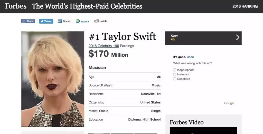 泰勒·斯威夫特(Taylor Swift)在过去的2016年中赚到了 1.7 亿美元,成为收入最高的名人。“小破团”One Direction 以 1.1 亿美元的收入位居第二。榜单中出现了 36 位歌手和 36 位体育明星,占据了名人榜的绝大多数席位,除此之外也不乏演员、主持人、魔术师等。