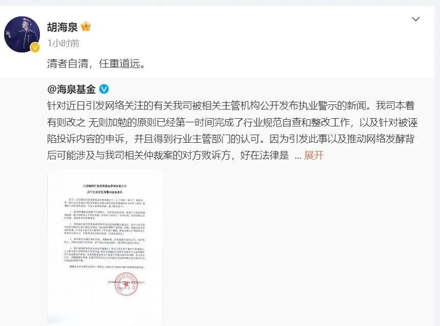随后,胡海泉转发该条微博并写道:清者自清,任重道远。