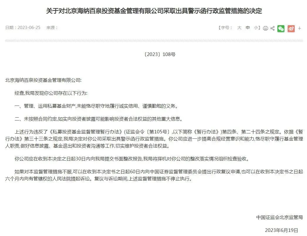 近日,中国证监会北京监管局在其官网发布了对北京海纳百泉投资基金管理有限公司(以下简称海纳百泉投资)采取出具警示函行政监管措施的决定。