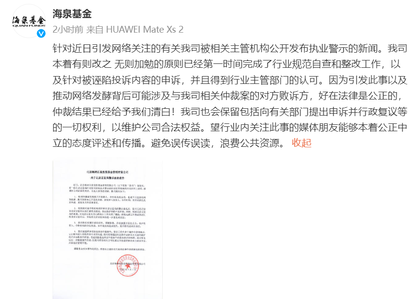 7月1日,@海泉基金 在微博发文,并附上了《关于北京证监局警示函的通告》。