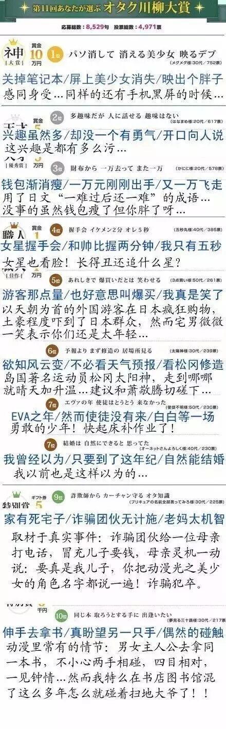 岛国2015年度宅男宅女“川柳”大赛获奖作品(川柳,五/七/五格式的打油诗,不要求押韵,可随意写出心中所思所想)