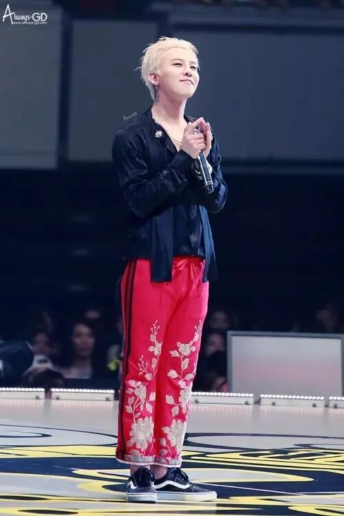 ▼说到玩色,权志龙也是一把好手!这条绣花枕头似的宽裤,广场舞大妈都驾驭不了......但被 GD 用随意的层次拉高比例,脚踩一双 vans 更是有型!