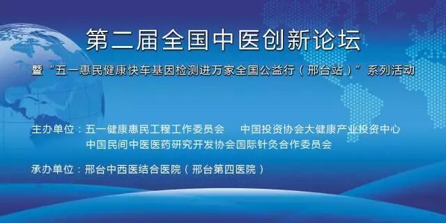 响应十九大报告,“坚持中西医并重,传承发展中医药事业”“为人民群众提供全方位全周期健康服务”“预防控制重大疾病”。由邢台中西医结合院(邢台第四医院)承办的“第二届全国中医创新发展论坛暨“五一惠民健康快车基因检测进万家”全国公益行系列活动”,将于12月16日隆重开幕。
