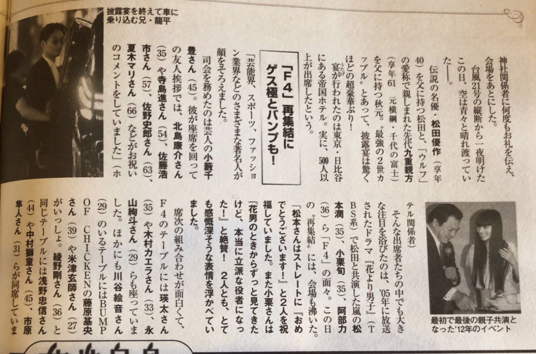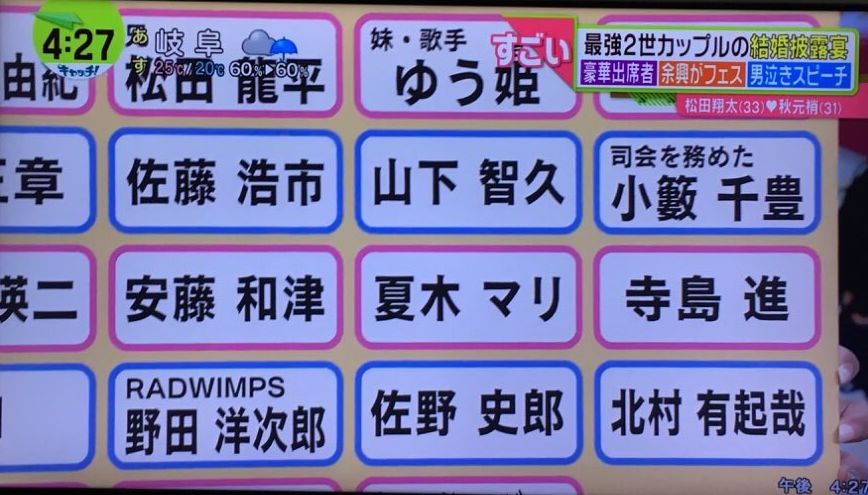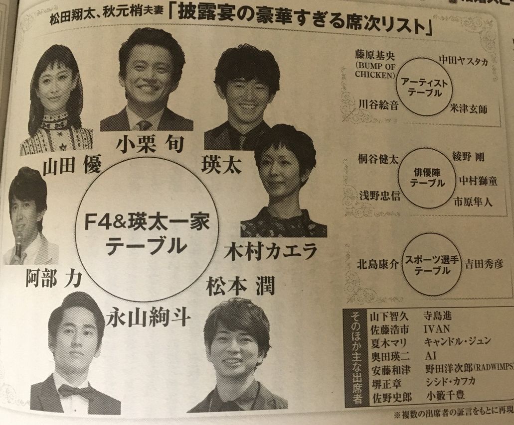 前两天「女性自身」公开了两张上周松田翔太&秋元梢在神社举行婚礼的照片,并且介绍了当天豪华婚宴的部分座位安排(下文介绍)。