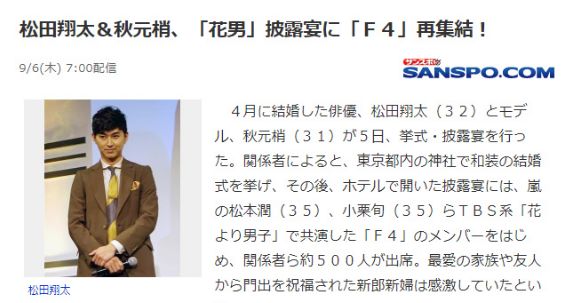 今年4月25日,日本演员松田翔太&模特秋元梢通过事务所宣布结婚,9月5日,两人先在东京某神社举行了和式婚礼,之后在东京帝国饭店举行了结婚披露宴。约有500名关系者参加了婚礼,未对媒体开放。