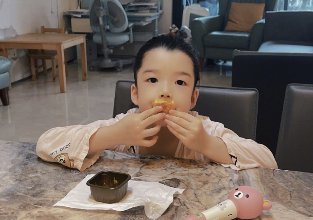 照片中的王唯伊吃着月饼,两眼放空,虽然是单眼皮,但是眼睛不算小。