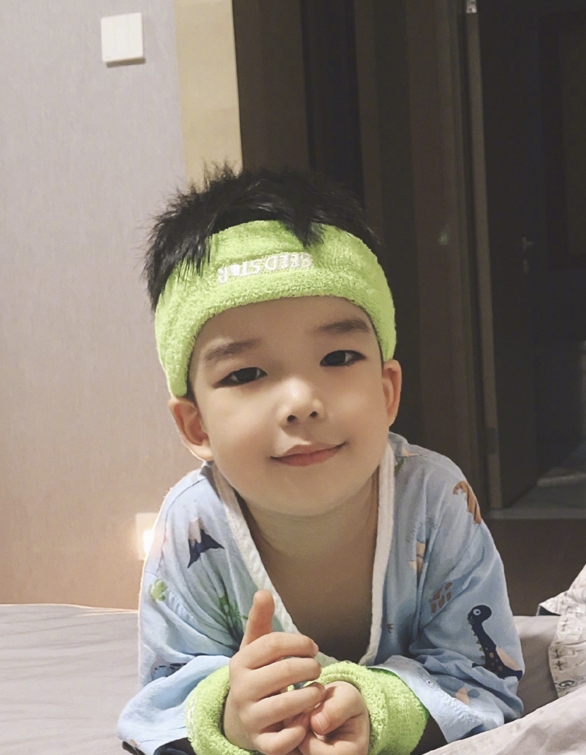 弟弟头戴银光绿发带,对着镜头流露绅士的微笑,同样也是单眼皮大眼睛,双目居然还有些自带眼线的效果。不知道的人还以为是王唯伊戴了发带呢!