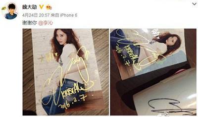 不过更好玩的是,全世界都知道水晶有一个迷弟叫魏大勋。在水晶注册微博的那天还@了他,而他的女友李沁为了魏大勋能开心,特意找大勋的女神郑秀晶为他签名,还录了视频。