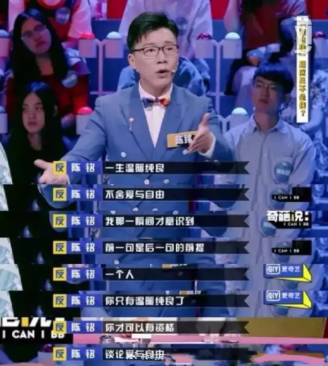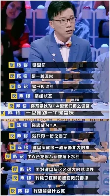 在《奇葩说》里,有一期的辩题是“键盘侠是不是侠”,我记得陈铭发布了一段戳心的言论: