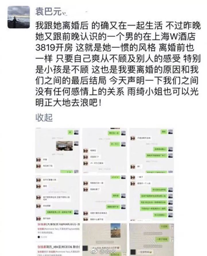 袁巴元更是频频曝出和张雨绮隐私的聊天记录,并插刀称“张雨绮有狐臭”“张雨绮私生活不检点,和认识不久的男人在酒店开房”……