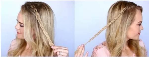 从两侧发顶各取出两缕头发,编织成三股辫。