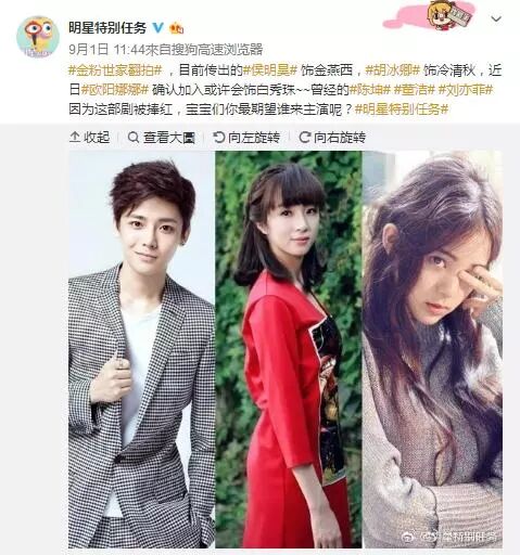 前不久《金粉世家》放出将要翻拍的消息,一时间网友都很关心演员人选,不少蓝V大号更是放出消息,在新版《金粉世家》中,金燕西一角或由侯明昊出演。