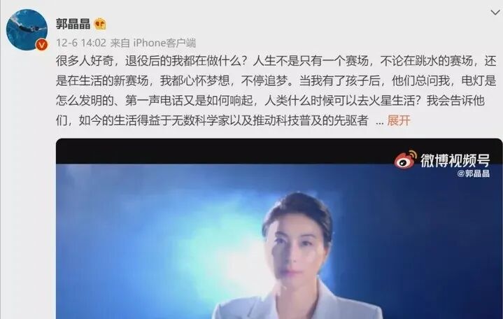 在2021年的12月6日,我国著名的跳水运动员郭晶晶在个人社交媒体上发布了一则令人瞩目的消息。她向公众宣布,自己已经成功地获得了一个全新的身份——大湾区科学论坛的“科创梦想家”。这个消息不仅令她的粉丝和公众感到惊喜,也引发了广泛的关注和讨论。