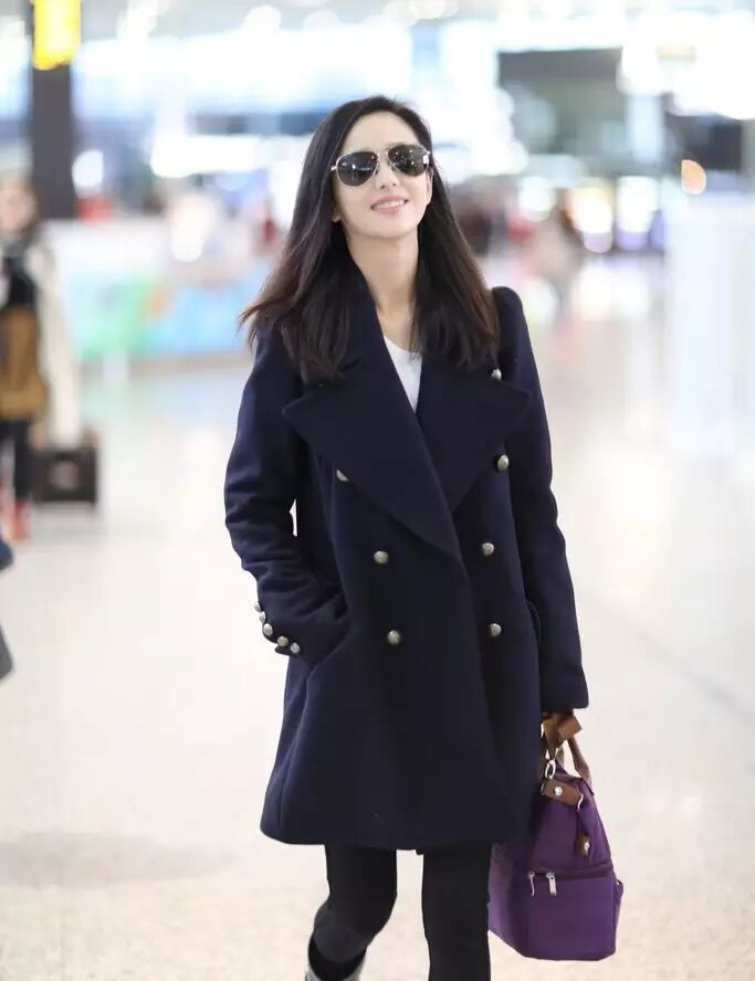 佟丽娅身穿深蓝色双排扣呢子大衣,内搭白色圆领T恤,下穿黑色紧身打底裤和短靴。